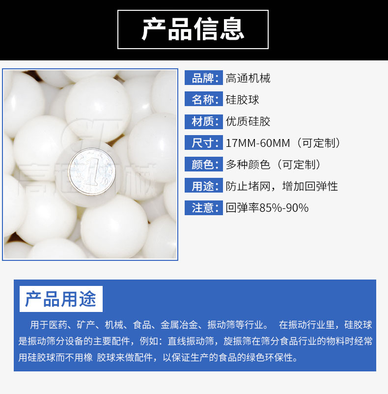 硅膠球是振動(dòng)篩專用的配件之一,有的生產(chǎn)廠家也叫它硅膠彈跳球或者硅膠彈力球。其實(shí)彈跳球還有一種橡膠的,但是在一些對(duì)環(huán)保要求較高的行業(yè),比如醫(yī)藥行業(yè)、食品行業(yè)、化工行業(yè)、水泥行業(yè)、糧食行業(yè)等等,我們會(huì)建議用戶朋友們使用硅膠球,因?yàn)槎呦啾?,硅膠球是不會(huì)對(duì)物料造成任何污染的。